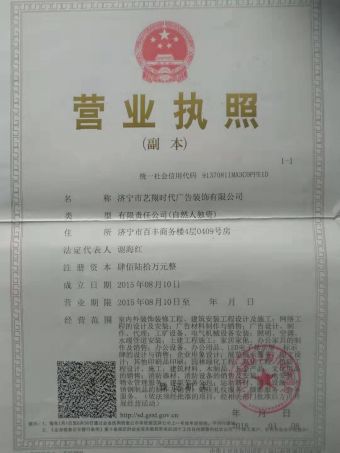 济宁市艺翔时代广告装饰有限公司位于济宁市百丰商务楼4层0409号房 主营范围:室内外装饰装修工程、建筑安装工程设计及施工;网络工程的设计及安装;广告材料制作与销售;广告设计、制作、代理;工矿设备、电气机械设备安装;照明、空调、水暖管道安装;土建工程施工;家居家俬、办公家具的制作及销售;办公设备、办公用品、LED电子显示屏、标示牌的设计与销售;企业形象设计;展览展示服务;图文设计;其他印刷品印刷;园林绿化工程、亮化工程、消防工程设计、施工;建筑材料、木制品、五金产品、文化用品的销售;消防器材、消防设备的销售及安装;水电安装;物业管理服务;建筑劳务分包;运动器材、游乐设施、不锈钢制品的制作及销售;婚庆礼仪服务、摄影服务、会务服务。