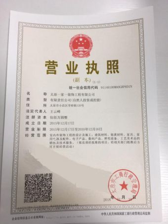 一家一装饰公司电话:18534159399,具有设计和施工双乙级资质,是太原规模较大的一家设计、施工、建材服务为一体的专业装饰公司。 是一家集家居产品研发、生产、销售、服务于一体的多元化集团企业。 一家一装饰—作为全国率先引进全欧洲辅材,德系工艺的集团化整装公司,以德国人的严谨精密和欧洲高品质的家居标准,创造舒适健康家居。 一家一装饰以“诚信经营,为客户营造健康家居”为宗旨,以家居产业链为主线,立足于中高端家居装饰设计与施工、材料和家居及后期配饰的供应、行业专业分析等多个方向,对相关家居产业领域进行深度家居集成和资源优化整合,构建了中国最具竞争力的装饰行业品牌,形成了国内最专业的家居产业的战略体系和格局。 公司凭借先进的管理模式、数千杰出的设计团队、严格的质量控制体系和卓越的企业文化,已成为行业的标杆企业。一家一装饰正朝着成为家居产业领导者的战略目标不断前进。