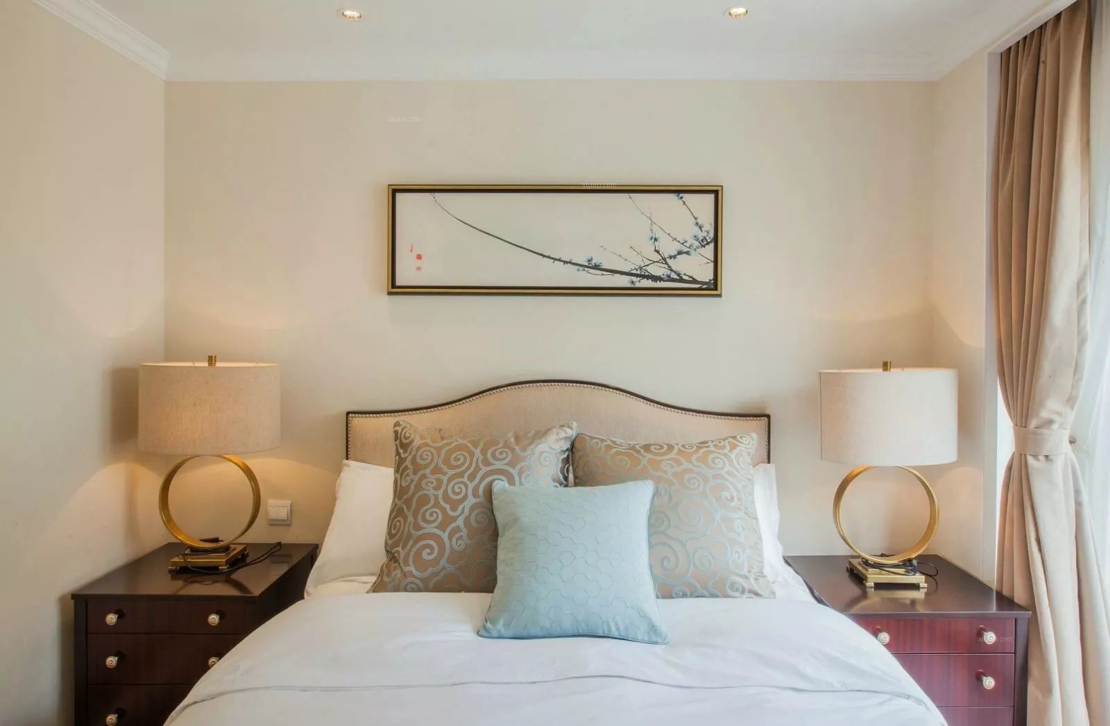 在床头挂上一幅艺术品可以提升整个房间的气质,那么挂画的摆放位置就非常关键了。