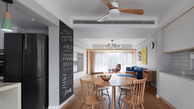 餐客厅之间也是采用开放式的设计,浅色的实木餐桌质地非常优良,一眼看上去就知道不是凡品,在加上精美的餐具,让餐厅显得档次感十足。在餐厅背景墙上还打造了一面小黑板,上面描绘了一些卡通图案,让室内显得更加时尚有活力,画面还可以随时更改,更具灵活性。