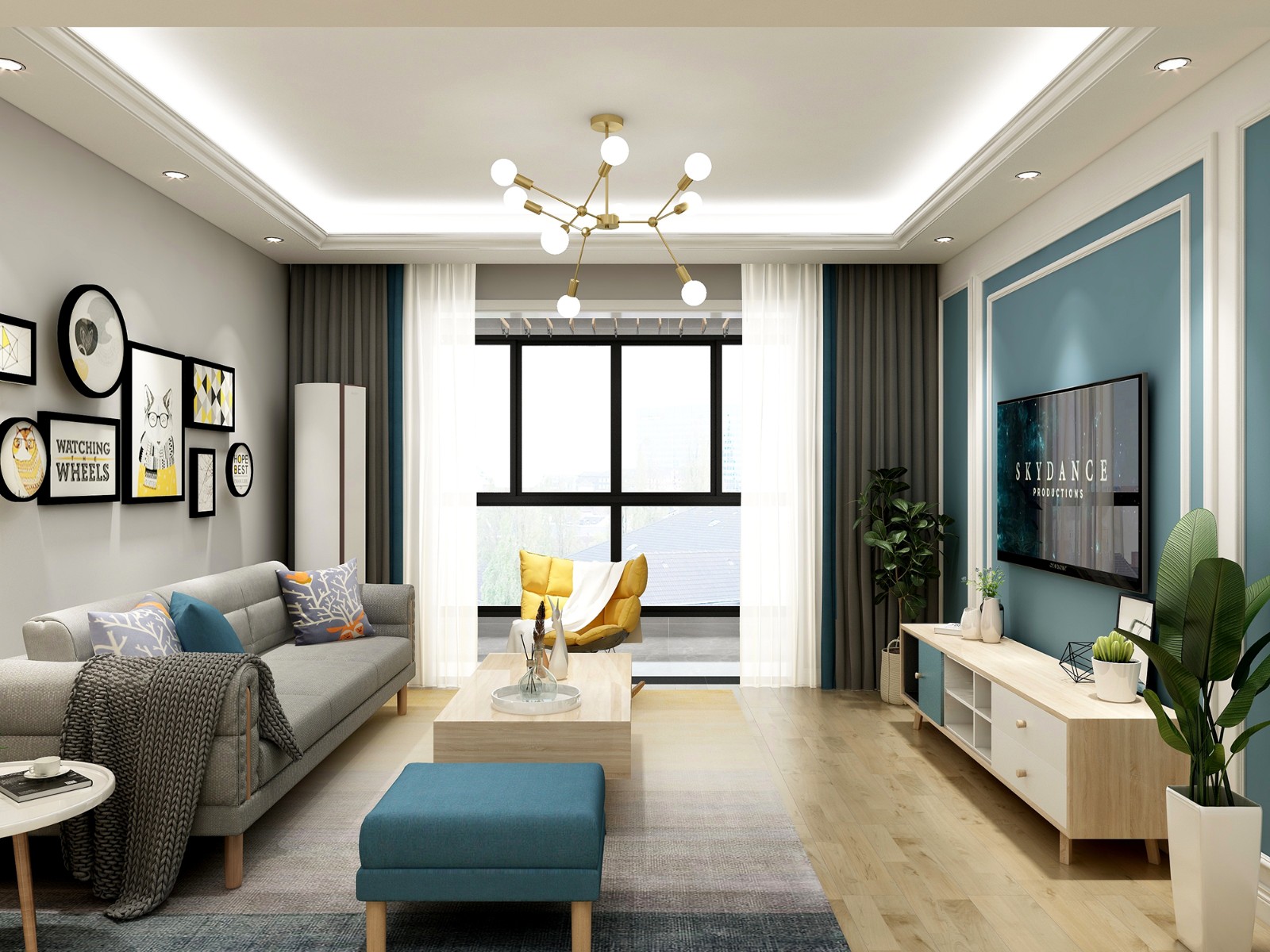 拼色的电视柜,与沙发、茶几等家具撞色,多种色彩的点缀,简约而高级,当整个空间赋予宁静轻松的感觉。