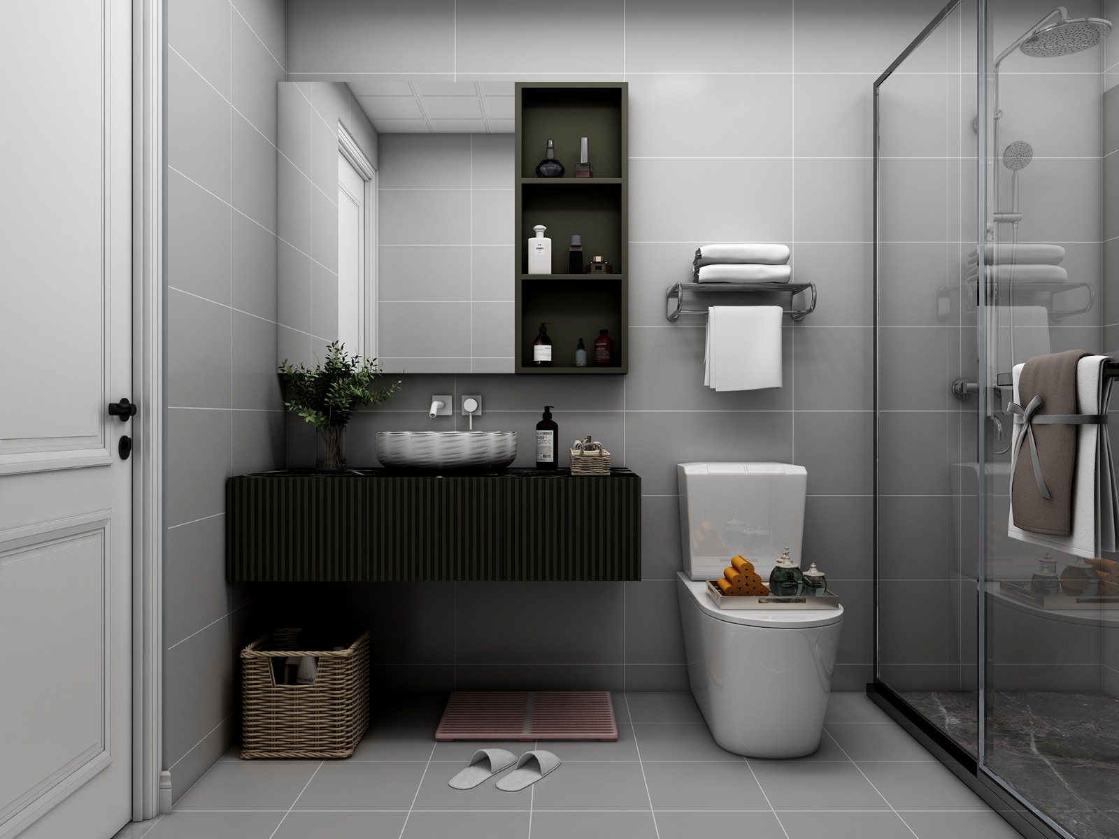 浴室柜更是采用深绿色,开放的储物柜,让所放物品一目了然,线条装饰,让小小的柜体富有时尚感。