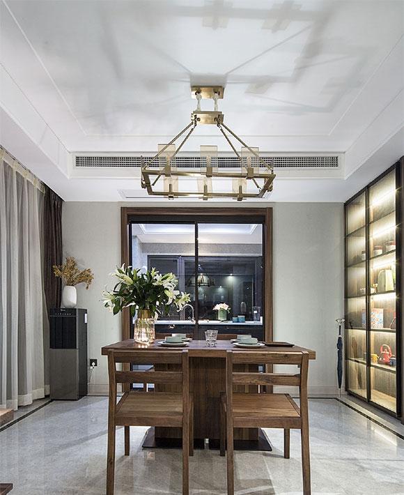 棕色的实木餐桌餐椅,配上一盏铁艺金色吊灯,墙面定制了一组带玻璃门的展示柜,大大提高了空间的装修档次。餐厅一侧就是用玻璃门隔开的独立厨房,封闭式的厨房空间,没有烹饪油烟扩散的问题。