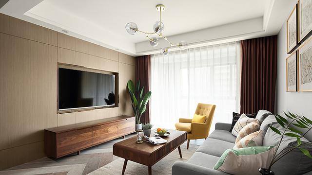 电视背景墙上采用打柜的方式,将电视机很好的镶嵌在其中,显得非常整齐大方,深色的实木电视柜非常精致宽敞,旁边还摆放了一些绿植点缀,能够为客厅增添更多的清新与活力。在茶几下面还铺上了这种灰色的地毯装饰,既美观又能大大提升客厅的舒适度。