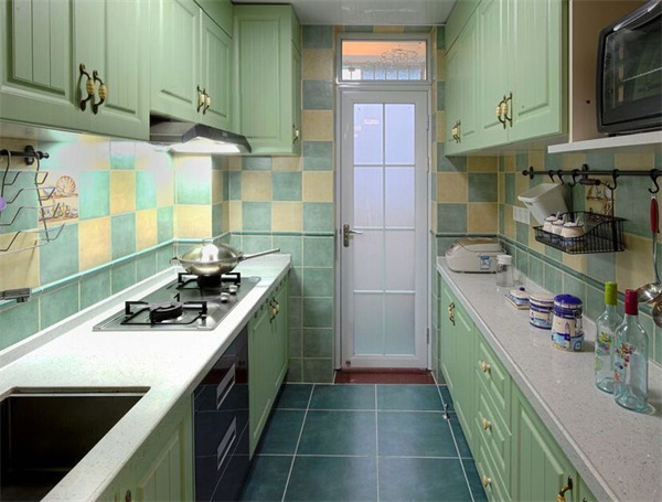 更为宽敞一些的厨房就可以做U字形的橱柜了,中间只需要留出一个人通行的空间,四周都是柜子,无论是储物还是操作空间都会更为充足。
