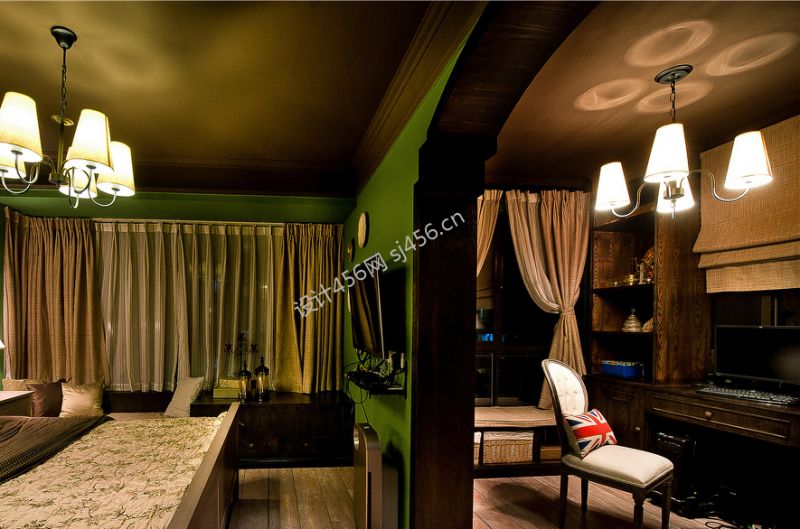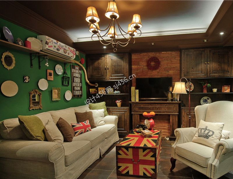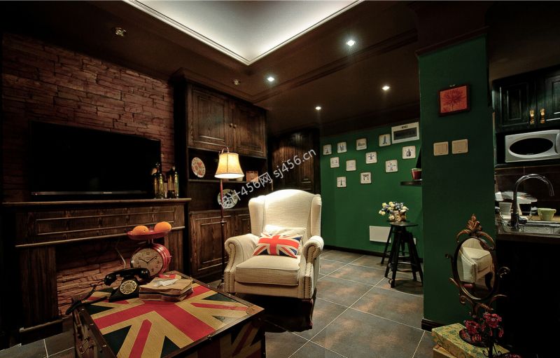 设计理念: 整体运用深绿色和咖啡色这样深沉且浓郁的色彩奠定英式庄重但且神秘的氛围,而选用颜色较浅的中性色家具和软装来达到整个空间的色彩的轻重协调。做旧处理的门、米字国旗图案的茶几和抱枕、一部老式**机都尽显英式复古情怀。 整体运用深绿色和咖啡色这样深沉且浓郁的色彩奠定英式庄重但且神秘的氛围,而选用颜色较浅的中性色家具和软装来达到整个空间的色彩的轻重协调。做旧处理的门、米字国旗图案的茶几和抱枕、一部老式**机都尽显英式复古情怀。