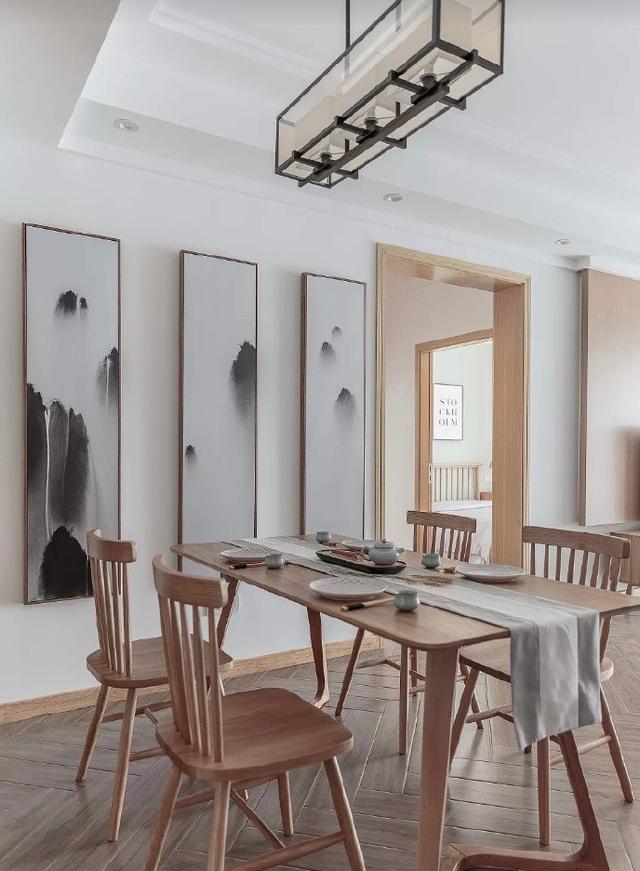 一款中式的餐厅设计,原木的餐桌椅搭配一盏亚麻布艺灯罩吊灯,极具质感与禅意,餐桌对面挂了三幅水墨画,虽是寥寥数笔,浓墨淡彩,却有一番独特的意境之美,就算再浮躁的心坐在这样一个地方吃饭,也能沉静下来吧。