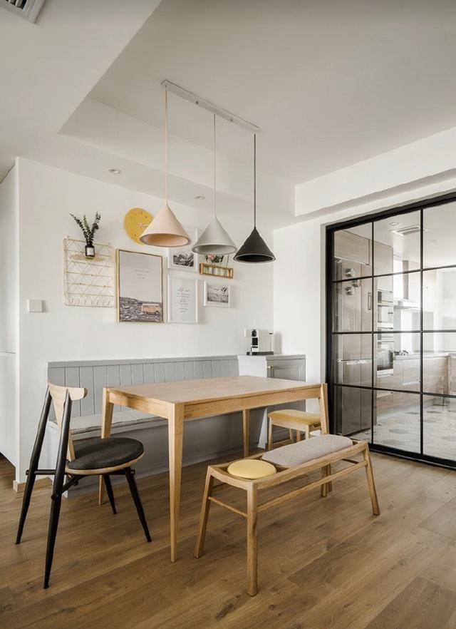 最后一款同样是卡座式餐厅,这个餐厅的设计也是小编最喜欢最满意的一个,除了原木的餐桌椅营造出温馨的用餐氛围以外,墙上的两幅挂画也特别有趣,让人感到身心放松,还能增强食欲。卡座背后用软木板照片墙作装饰,可以在上面贴上一些生活和家人照片,构成家中最温馨一角,将美好的回忆永久定格在家中。