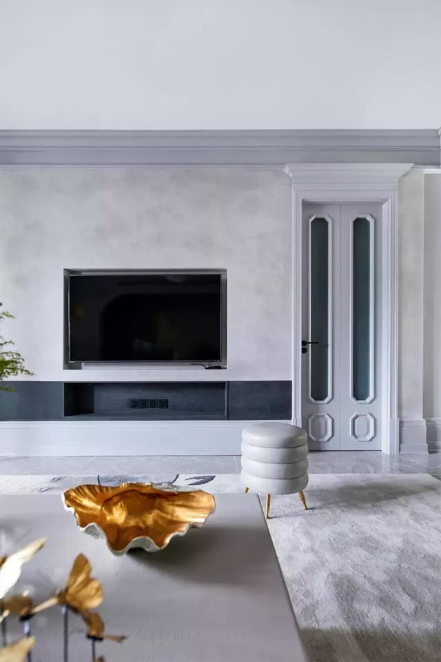 客厅的电视背景墙上刷了灰色调的艺术漆,搭配同样灰色的石膏线造型,背景墙的侧方还有着一扇典雅的门框造型,让人感觉到一种朦胧的艺术感。