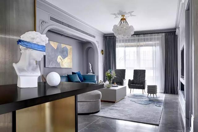 客厅的沙发背景墙处是做了一个拱门的造型,拱门内部两侧都摆放了柜子和装饰品,蓝色调的皮沙发在灰色调的空间内,显得更为宁静、优雅。