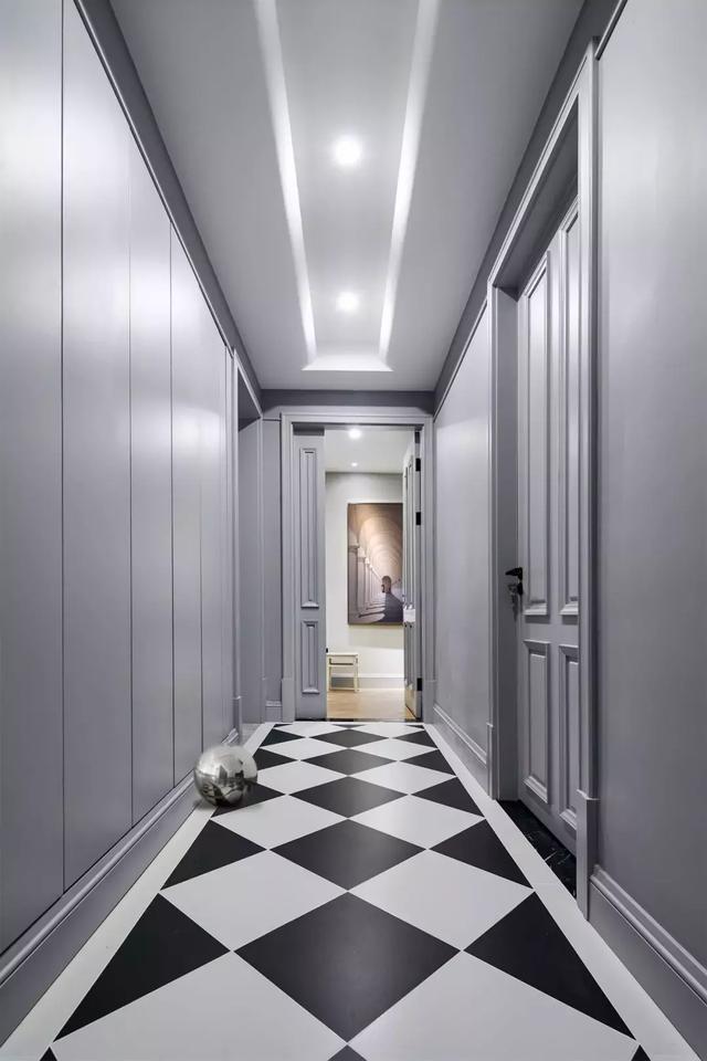 在隔断的后方就是通往卧室和卫生间的走廊过道,其中一侧墙面做了嵌入式的到顶柜子,另一侧也刷成相同的漆色,整体感很强。