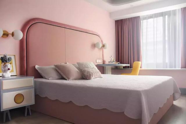 儿童房是选择了更为可爱、浪漫的烟粉色作为主色调,床头背景墙和床、窗帘连通起来,让整个儿童房给人一种梦幻的感觉。