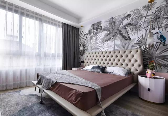 老人房的床头背景墙铺贴了黑白色的植物壁纸,搭配软质的床头靠背和红褐色的床单,带来一种简约舒适而又充满时尚、典雅的感觉。
