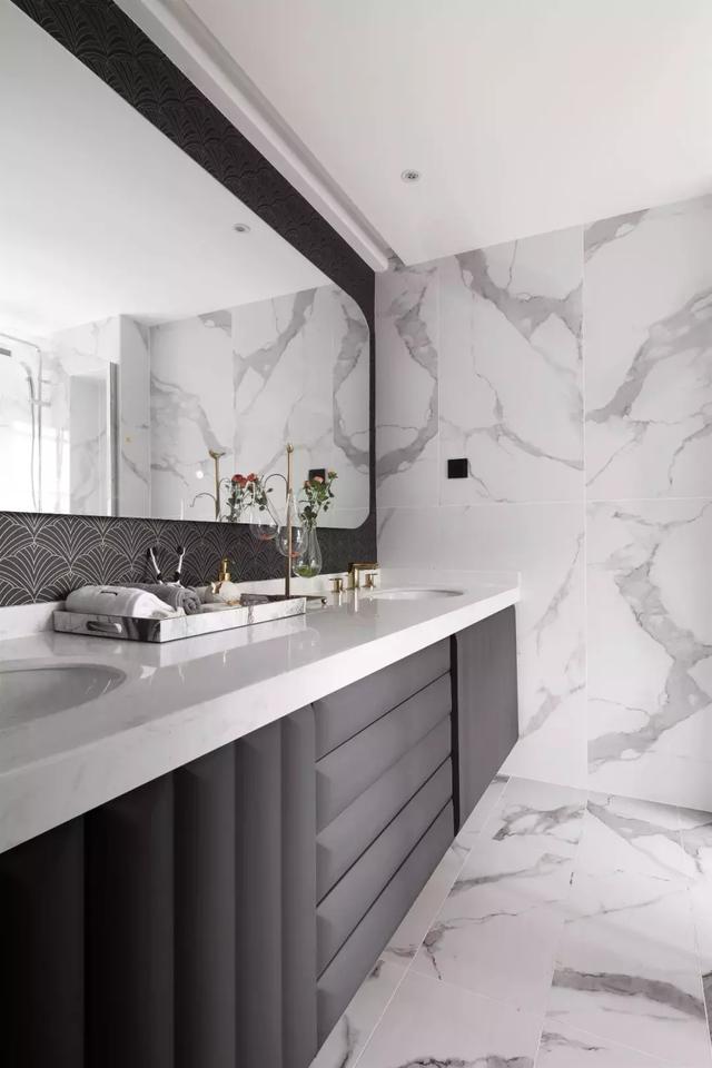 卫生间内的墙地面铺贴白色的大理石瓷砖,在浴室镜的四周做了艺术化的处理,搭配灰色调的浴室柜和金属质感的五金,让人感觉非常精致。