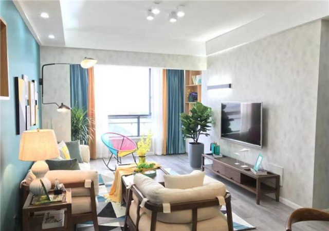 电视背景墙没有额外的装饰,就简单的墙纸,颜色比较浅,看电视的时候颜色太深的话容易喧宾夺主。