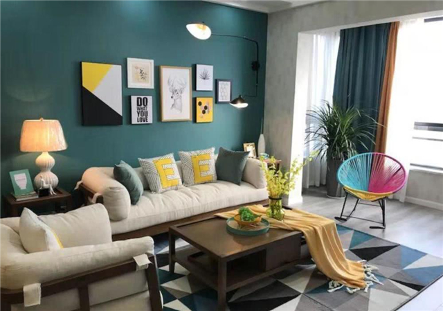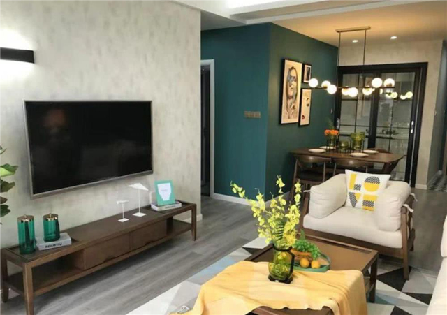 电视背景墙只有墙纸的话显得有点太过单调,所以增加了一些装饰挂画。茶几下面铺了一张地毯,就这么简单的一些软装,让原本挺简单的效果变得生动起来。