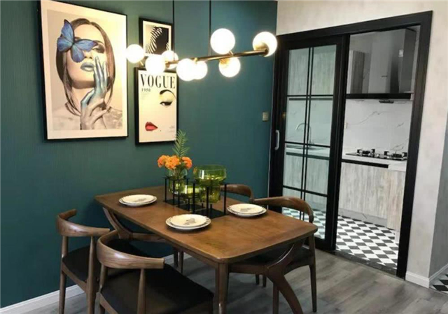 我们再回头来看看开放式餐厅,墙壁上的墙纸和沙发背景墙一个样,餐厅就摆放了一张清新风格的餐桌椅。