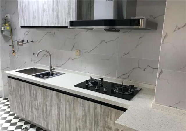 L型小厨房,空间并不是很大,不过装饰风格倒是特别的时尚清爽,而且还很耐脏。装了灰色柜门的橱柜和吊柜,收纳功能挺不错的。