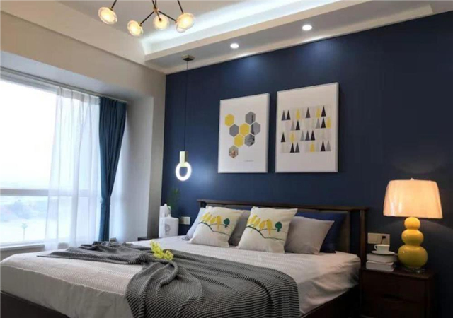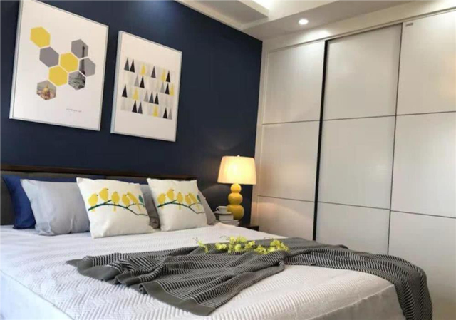 这边是主卧室,铺了和客厅一样的淡灰色木地板,墙壁上贴了深蓝色的墙纸,也挂了装饰画框。为了增加足够的收纳功能,特别定制了一整面墙的收纳衣柜。