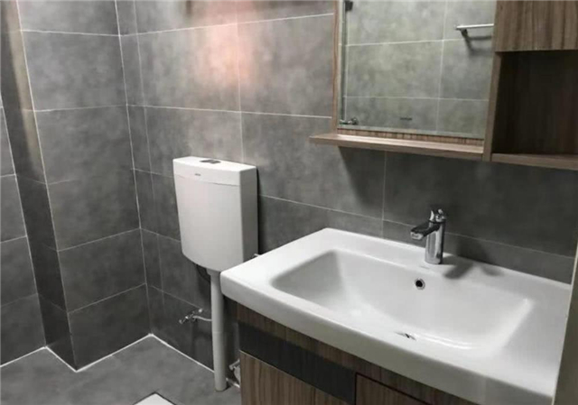 最后看看卫生间,墙壁和地板都贴了灰色的瓷砖。灰色给人一种非常时尚的感觉,而且比较耐脏。卫生间装的是蹲盆,打扫方便,实用起来也比较卫生,而且干湿分离功能都可以节省了。