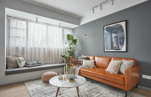 灰色的背景墙映衬下,一张橘黄色的皮质沙发越发显眼,带着些许的美式复古情调,而蒲墩、小茶几、菱形抱枕又是一番北欧的清新气息。