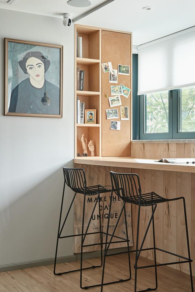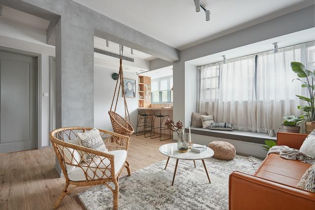 客厅打通电视墙,将休闲区纳入客厅,装上吧台和吊椅,优哉游哉。