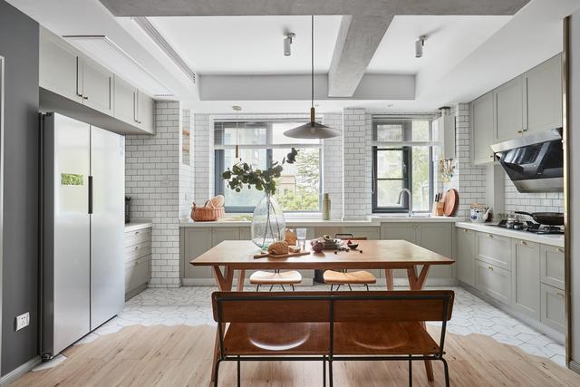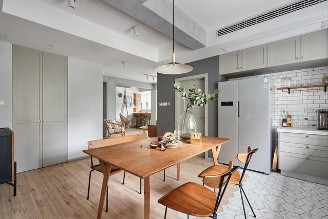 厨房和客厅地面使用地板和瓷砖无缝拼接,六边形花砖搭配上原木色地板,温润素朴之中蕴藏一丝时尚的气息,餐桌上一点绿色的点缀,便焕活了生机,增强空间的鲜活感。