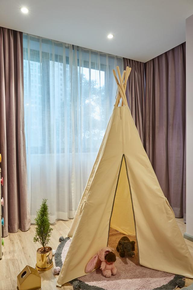 浅黄色的儿童帐篷、卡通的墙面装饰,彰显出无限的童趣与活力。