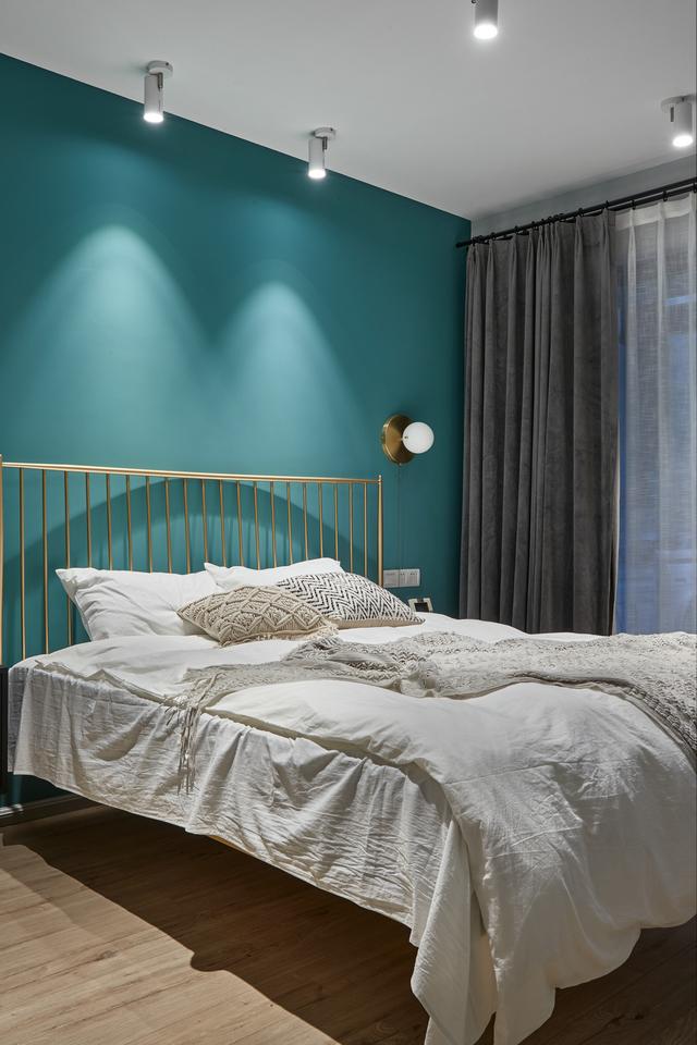 主卧删繁就简却不失设计感,绿色的背景墙带着强烈的视觉冲击力,而低调的米白床品则营造柔和感,金色的床靠背和墙面壁灯又彰显出一丝精致轻奢的质感。