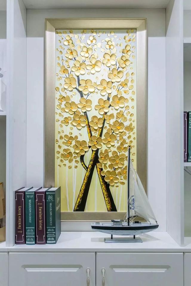 底部柜子可以收纳家里不常用的东西,上面是展示柜,可以放一些杯子等餐具,也可以摆放一些好看的装饰品,让家里更加充满时尚气息。中间插入一张自己喜欢的装饰画,时尚又美观!
