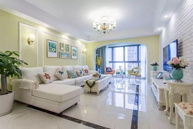 墙壁装修用浅黄色乳胶漆来装饰,电视背景墙用简单的文化砖,白色的沙发茶几电视柜跟整体的浅黄色搭配非常清新。沙发背景墙上几幅不同尺寸的装饰画,就把客厅变得时尚感十足。