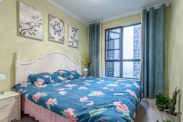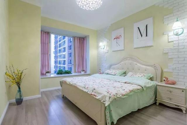 小碎花加薄荷绿的床品,还有一个美美哒飘窗!背景墙延续了电视背景墙的文化砖,还有两幅北欧风的抓受那个会华,对称的床头柜和逼疯都很好看,简直就是满满的少女心啊!