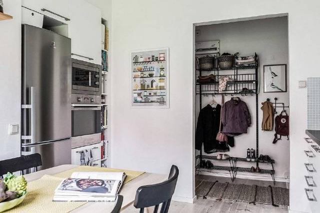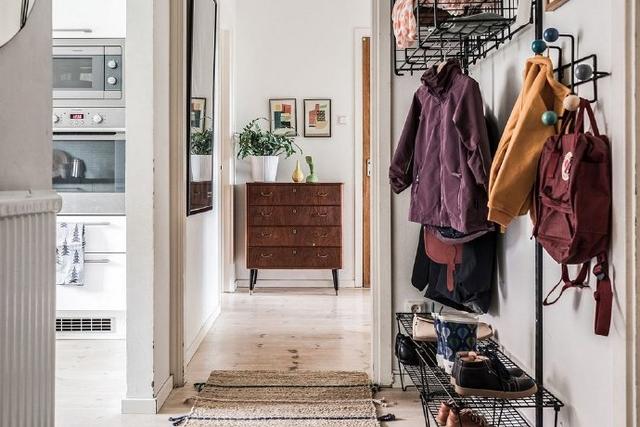 长长的玄关过道,靠墙安装了一个铁艺收纳架,上层留有挂钩,可以用来放置一些衣物与挎包,底层的双层鞋架也是非常实用的。过道尽头摆放一个玄关柜,收纳与展示一体,绿植的点缀显得整个空间充满生机与活力。