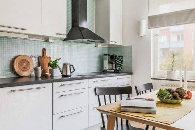 一字型的橱柜,墙面采用小方砖铺贴,薄荷绿方砖与白色橱柜的小清新配色,搭配简易实木餐桌,整体给人一种清爽整洁的感觉。餐厨空间留有一个窗户,采光也非常好。