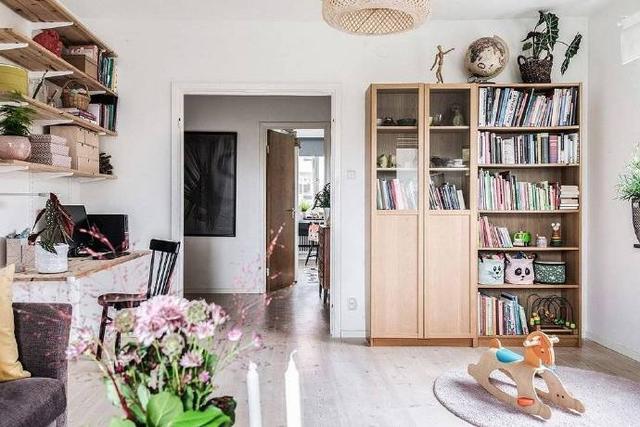 过道尽头右侧就是进入客厅的部分,为了更好的利用空间,在客厅的布置上,把客厅与书房结合在一起。一张简易的实木书桌靠墙摆放,墙面做了4层的隔板收纳,大面书架的设计可以容纳更多的书籍。