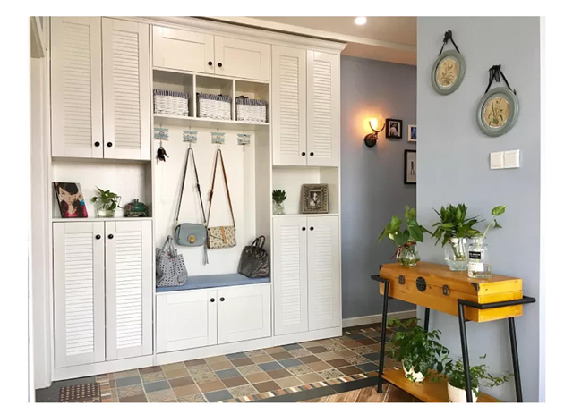 一进屋就被迷住,玄关设计非常到位,让人进来眼前一亮。玄关鞋柜展现、收纳柜、收纳筐、挂钩、换鞋凳一应俱全。玄关鞋柜中间留空位置,可以非常方便的挂包包或者挂衣服,很实用。鞋柜两边中间都留空位置,可以放其他常用的东西,不过现在暂时摆放摆件做装饰,效果真好看,我们家人都很喜欢。很多邻居过来参观,都很羡慕呢。