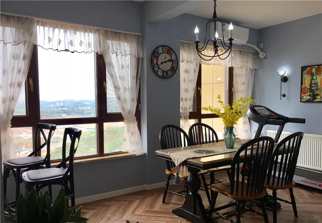 这本来是入户花园,考虑到空间大小,最后我们改做了餐厅,使得空间给人的感觉大一些。布置我们家人都比较喜欢的实木餐桌,平时家里人多来客人的时候,也可以方便挪动餐桌位置。窗户比较多,采光非常充足。