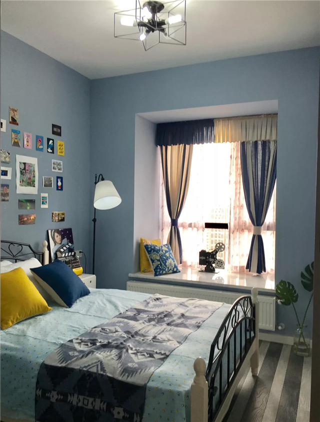 这是主卧,装修其实非常简单,墙面都是蓝色,搭配黄色的窗帘非常搭配,效果也不错。布置了一张双人大床,床上四件套非常喜欢。