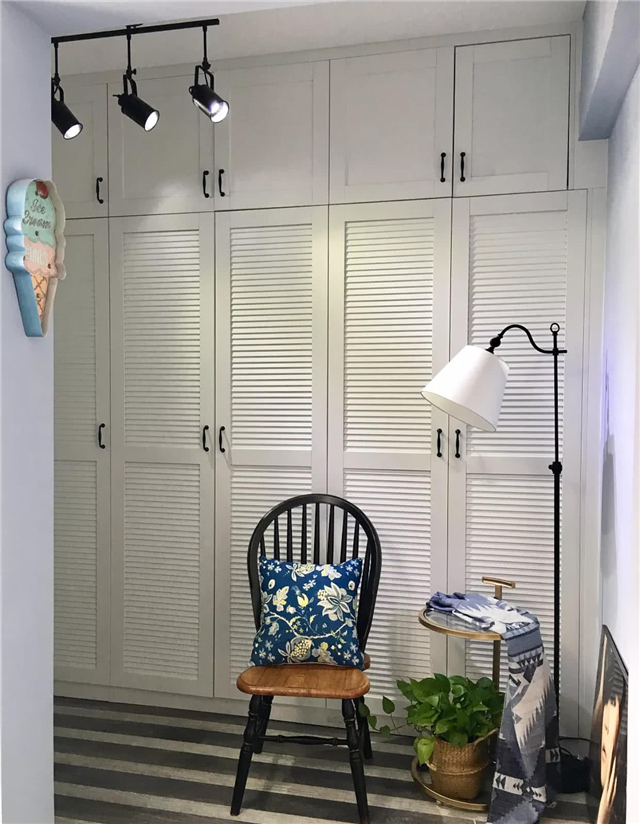 主卧有一个独立的衣帽间,对于我们女人来说非常喜欢。衣柜是在外面定制的,柜门做了百叶非常不错的。地面铺的是条纹地毯,与酒店的客房一样,很时尚。
