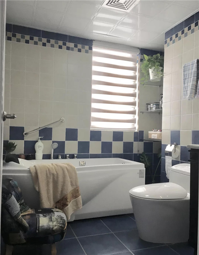 主卧卫生间空间蛮大的,安装了一个我们家人都很喜欢的大浴缸,可以很舒适的泡澡。地面铺的蓝色瓷砖,很耐脏也比较防滑。