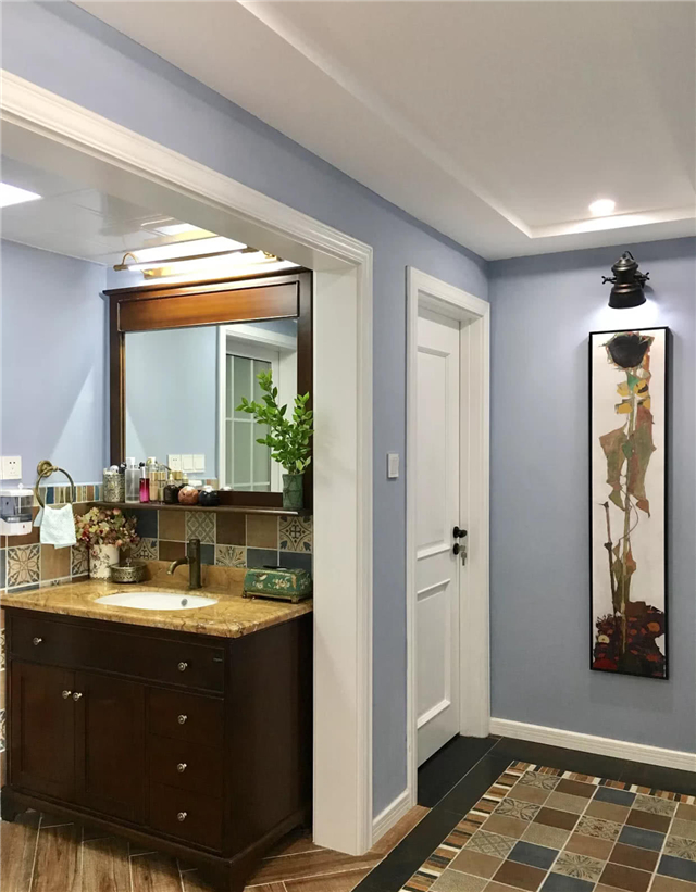 左边是公共卫生间浴室柜,做了开放式的,平时不管是家人还是客人来的时候,需要使用都方便很多。过道挂着一幅长方形的装饰画,特别满意,装饰画效果很不错。