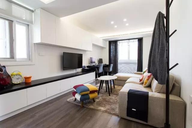米黄色的舒适沙发,中和了只有黑白两色带来的冷酷与严肃,使客厅多了一丝温馨。当然,让人过目不忘的还有茶几旁有个性的小凳子,多种色彩拼接而成,可爱又活泼。电视上方延伸出来的收纳柜,让整个空间更有层次感。