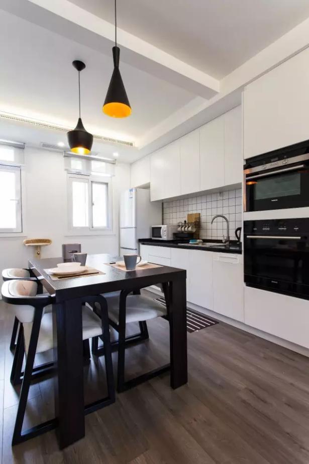 开放式的餐厨房与餐厅连接在一起,黑白搭配让这个空间更显干净明亮。看厨房电器,淡淡的传递出西式餐饮的感觉,所以也不用担心油烟过大造成室内空气污染。深色的餐桌椅,搭配造型独特的吊灯,体现出主人精致的生活。