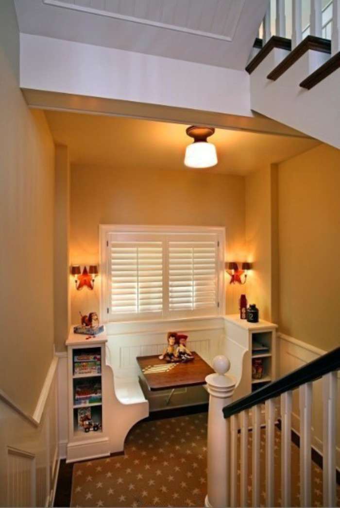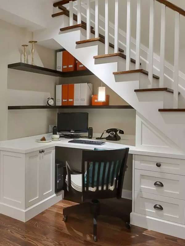 如果不喜欢楼梯下方三角形空间,就把前边堵住,做出一个四方四正的小书房。多姐小时家里是那种农村的小二层楼,虽然家里不缺地儿,但是我家的楼梯下方也利用上了,用来放煤球。