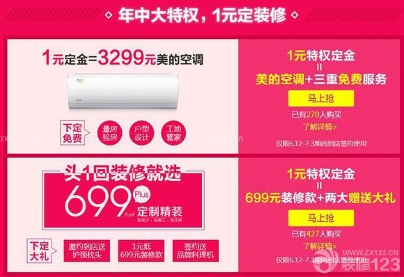 不能错过之一:一号家居网年中大促隆重推出1元定金=3000元美的空调+三重免费服务,年中大特权,省到家了!签单+1元就能换购价值3299元的美的空调,还能享受量房验房、户型设计、工地管家三重免费服务,门槛超低超优惠!