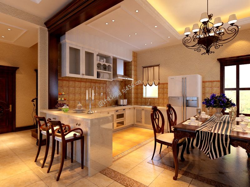 美式田园混搭风格开放式厨房餐厅设计装修图片