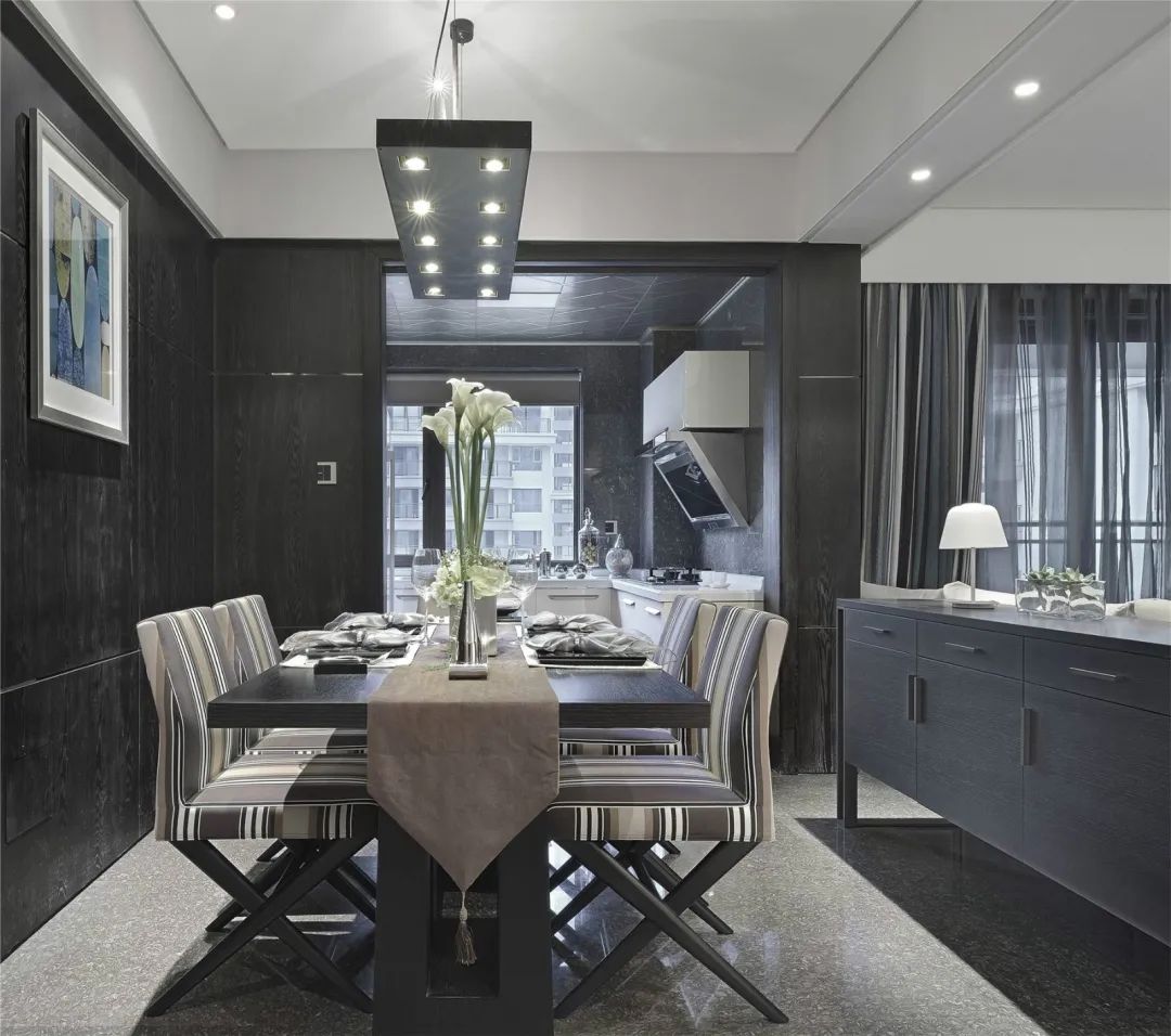 独立式布局适用于空间较大的居室。选择一间与厨房相近的房间作为餐厅,在这个空间内,既能满足吃饭这一功能性需求,又可以作为厨房收纳的延伸。而且独立充足的空间也更有利于房主或者设计师设计思想的发挥。