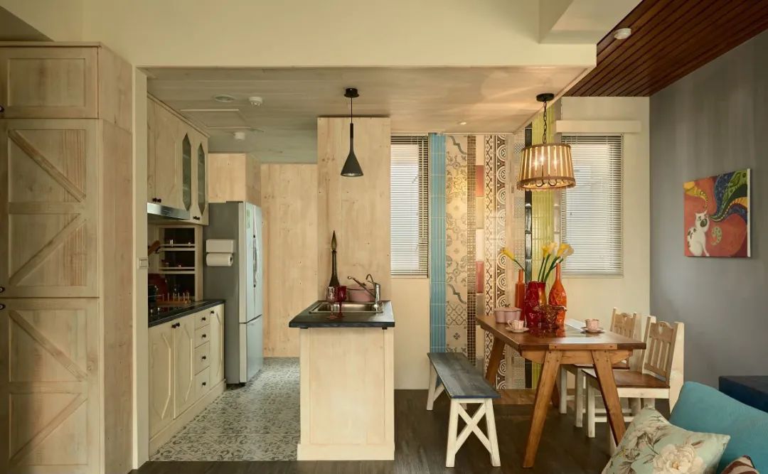 对于一些小户型来说,要么没有独立的餐厅空间,要么餐厅面积很小,可以通过采用开放式厨房或者吧台、卡座的形式,打通餐厅和厨房之间的隔阂,将这两个空间进行一体化设计。