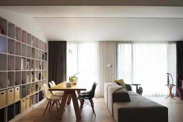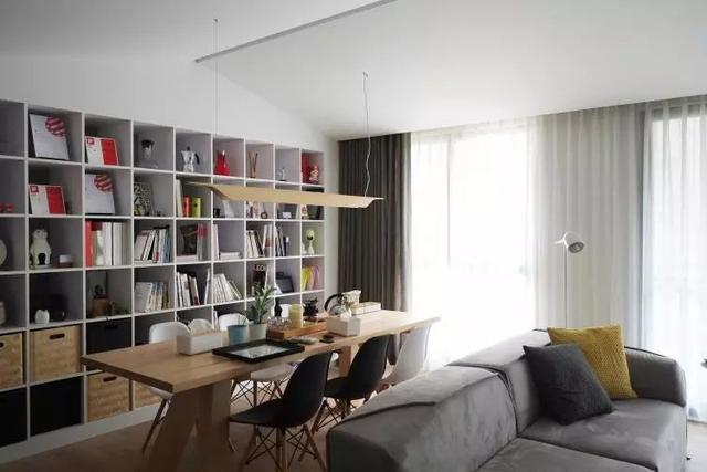 餐厅与客厅为一体式设计,加长版餐桌可容纳多人聚餐使用。后面墙面设计可变换收纳柜,增加空间收纳,让琐碎物品有处归置。