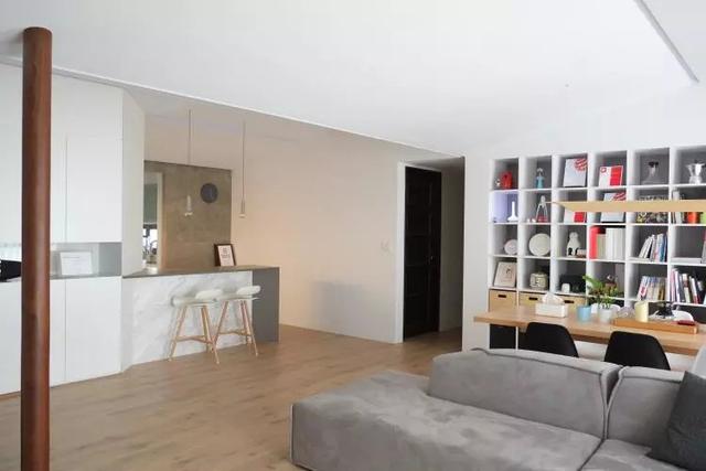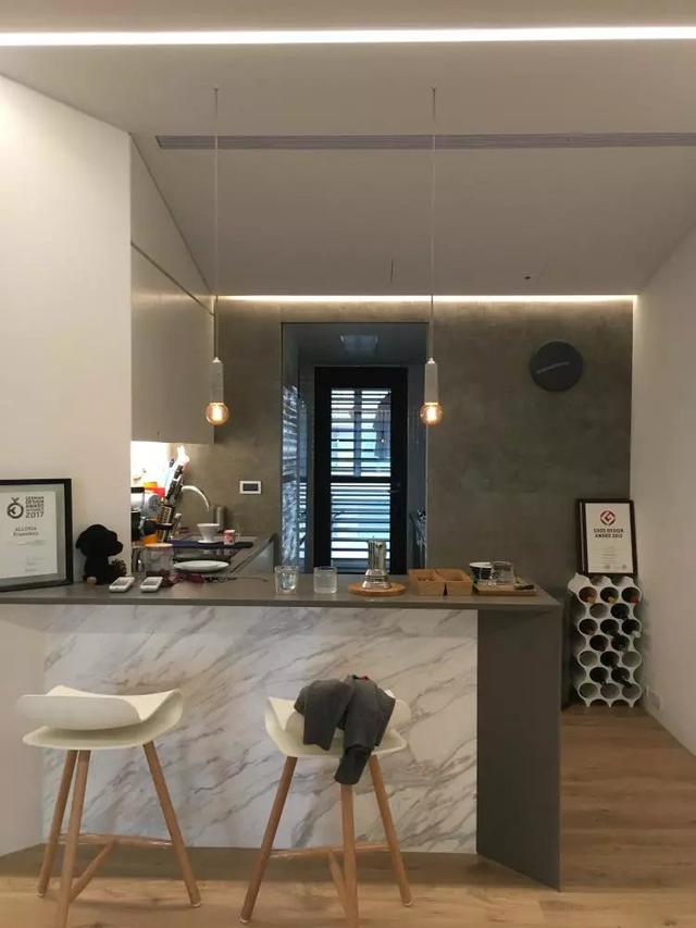 厨房也设计成了开放式,还设计了一个吧台,白色柜体搭配银灰色大理石,看起来超具现代质感。